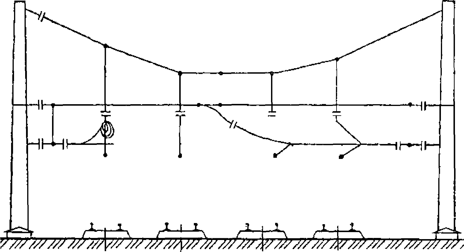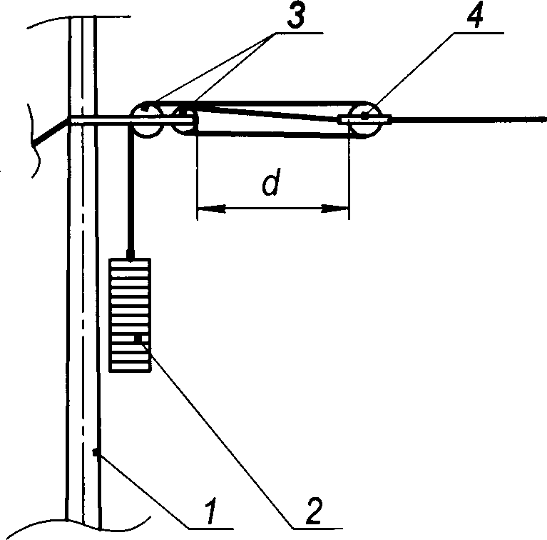 1 - несущий трос, 2 - веревка полиспаста, 3 - шунт, 4 - контактный провод.