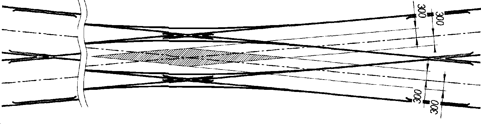 Взамен разрушенной опоры гибкой поперечины могут быть установлены две, а в отдельных случаях и три временные промежуточные опоры (при этом крайняя - с оттяжкой), которые дают возможность поделить гибкую поперечину на две или три группы подвесок; промежуточные опоры в таких случаях устанавливают в междупутье или по оси пути, который в этом случае должен быть временно закрыт для движения поездов до полного восстановления контактной сети.