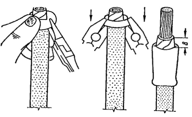 Подготовленные медные соединительные гильзы или наконечники надевают на концы жил кабеля таким образом, чтобы жила входила в наконечник до упора, а в соединительную гильзу - на половину ее длины.