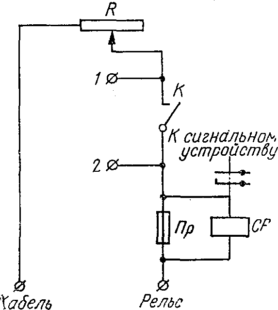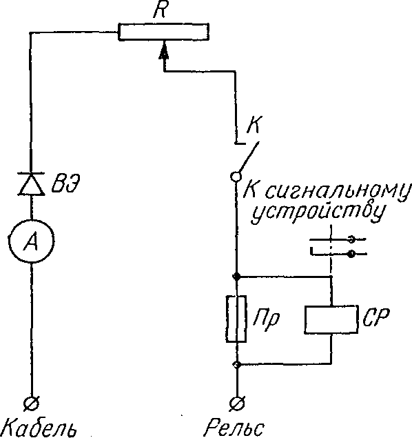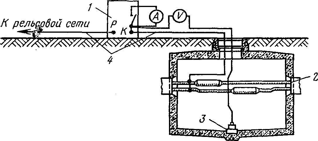 Потенциал рельса по отношению к земле | - | условно принимаемая разность электрических потенциалов между данной точкой рельса и точкой земли, находящейся на расстоянии 10 - 30 м от крайней нитки рельсов. |
