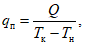 - определить продолжительность испытания трубопровода (Tк - Tн), мин, объем дополнительно подкачанной в трубопровод воды из мерного бачка Q, л, (для первого варианта), разность между объемами подкачанной в трубопровод и сброшенной из него воды или объем дополнительно подкачанной в трубопровод воды Q, л, (для второго варианта) и рассчитать значение фактического расхода дополнительного объема подкачанной воды qп, л/мин, по формуле