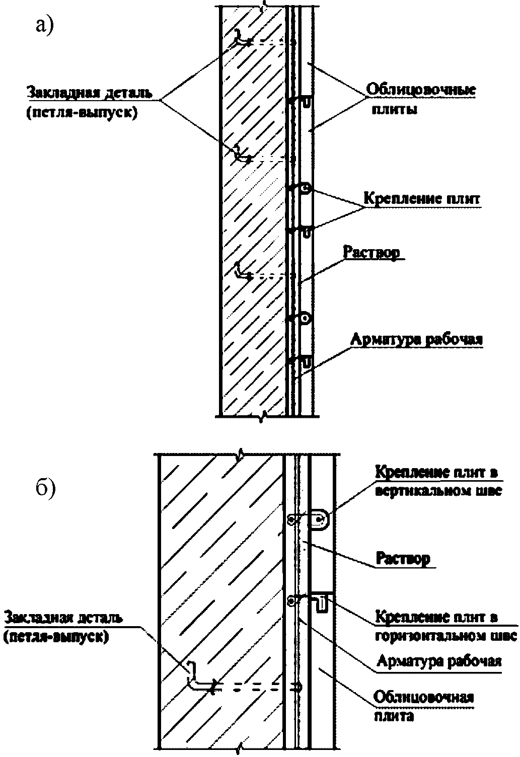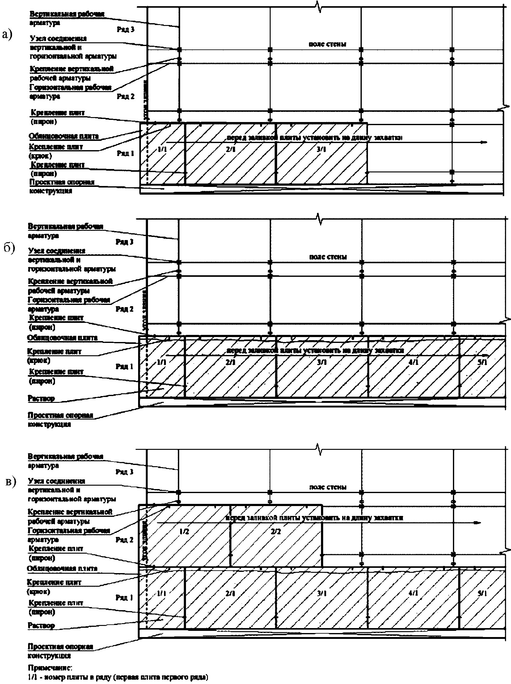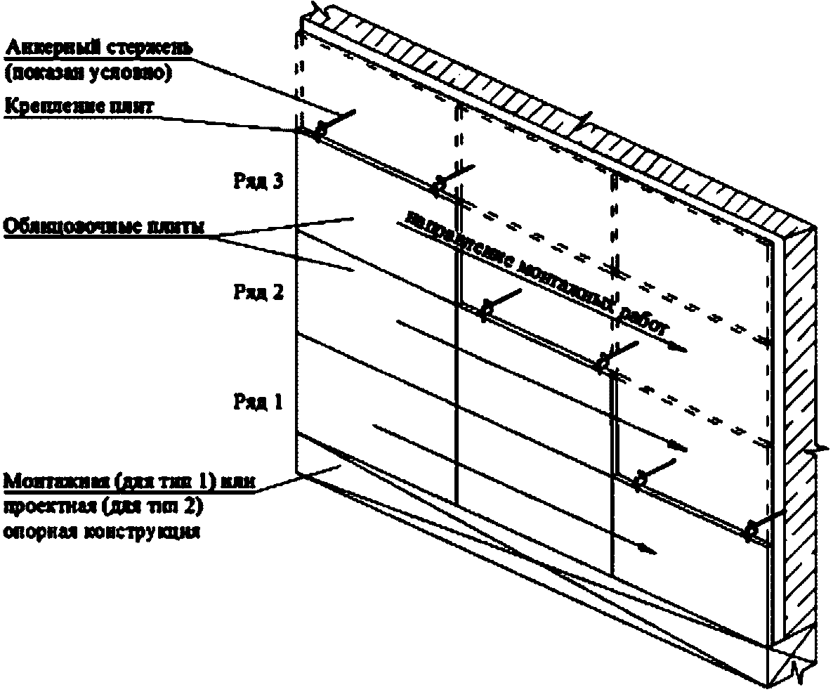 3.2 арматурный каркас: Горизонтальные и вертикальные стержни из арматуры гладкого или периодического профиля, соединенные между собой в плоскости облицовочного слоя в ортогональных направлениях и служащие для крепления облицовочных плит.