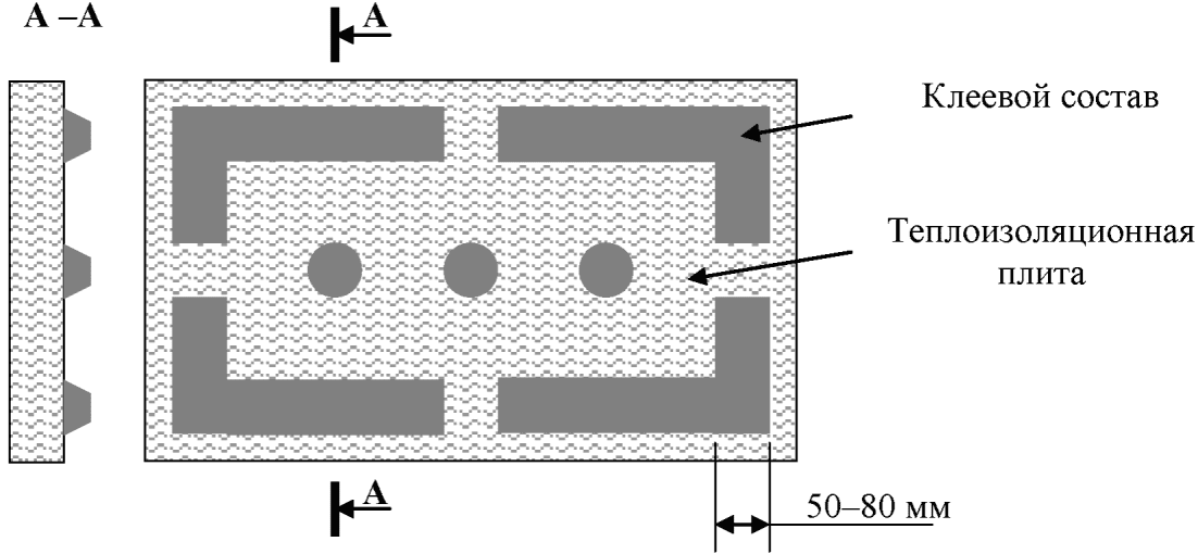 5.2 | Нанесение клеевого состава | Контроль нанесения клеевого состава на поверхность теплоизоляционных плит | Документарный | Запись в журнале производства работ о выбранной в соответствии с требованиями 4.4.4, 4.4.5 схеме нанесения клеевого состава | | |