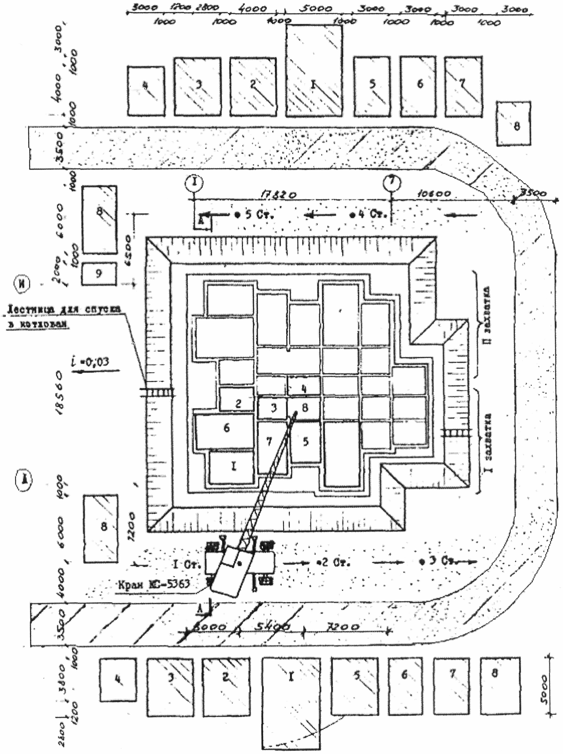 2.2. Элементы скользящей опалубки и гидрооборудование монтируют при помощи пневмоколесного крана КС-5363, который должен работать на спланированном и уплотненном основании, засыпанном щебнем (