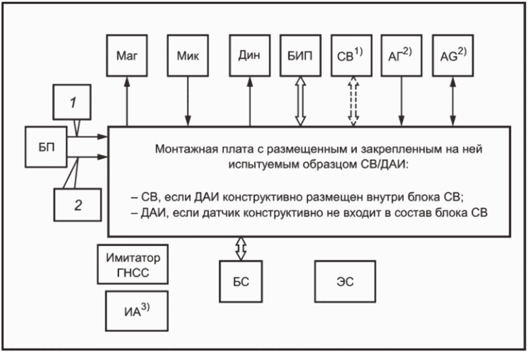 <1> В зависимости от производителя ЭС как средство измерений, предназначенное для измерения и анализа амплитудно-частотных характеристик и параметров модуляции систем подвижной радиотелефонной связи в сигнальном и несигнальном режимах, имеет различные наименования: тестер или анализатор радиокоммуникационный, установка для тестирования средств мобильной связи и др. <2> Имитатор сигналов ГНСС используют в случае, если при проведении испытаний, указанных в разделе 6, невозможно обеспечить возможность приема УВ реальных сигналов ГНСС. <3> Установка акселерометра на столе (каретке) ударного стенда или на ТС - в соответствии с требованиями ГОСТ ИСО 5348. Эталонный акселерометр должен быть утвержденного типа и поверен. <4> Длина соединительных кабелей, используемых для подключения размещаемых на монтажной плате испытуемых образцов (УВ или ДАИ) в соответствии со схемой, приведенной на рисунке В.1, должна выбираться с учетом значений рабочего хода стола (каретки) ударного стенда. | |