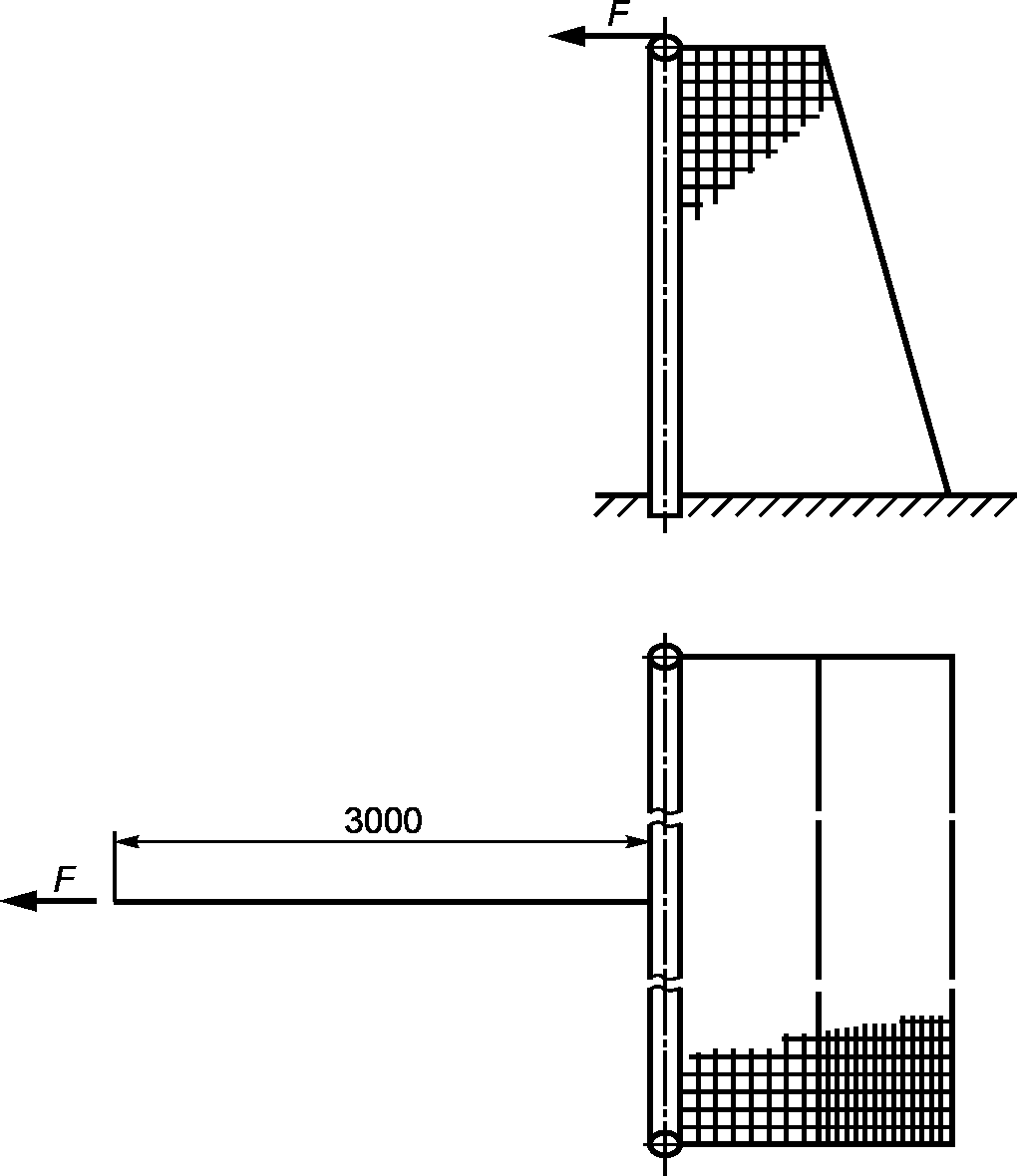 Прикладывают в середине ворот к ячейкам сетки, расположенным на 1000 мм ниже перекладины, горизонтальную сосредоточенную нагрузку F = (1100 +/- 50) Н и выдерживают в течение 10 с.