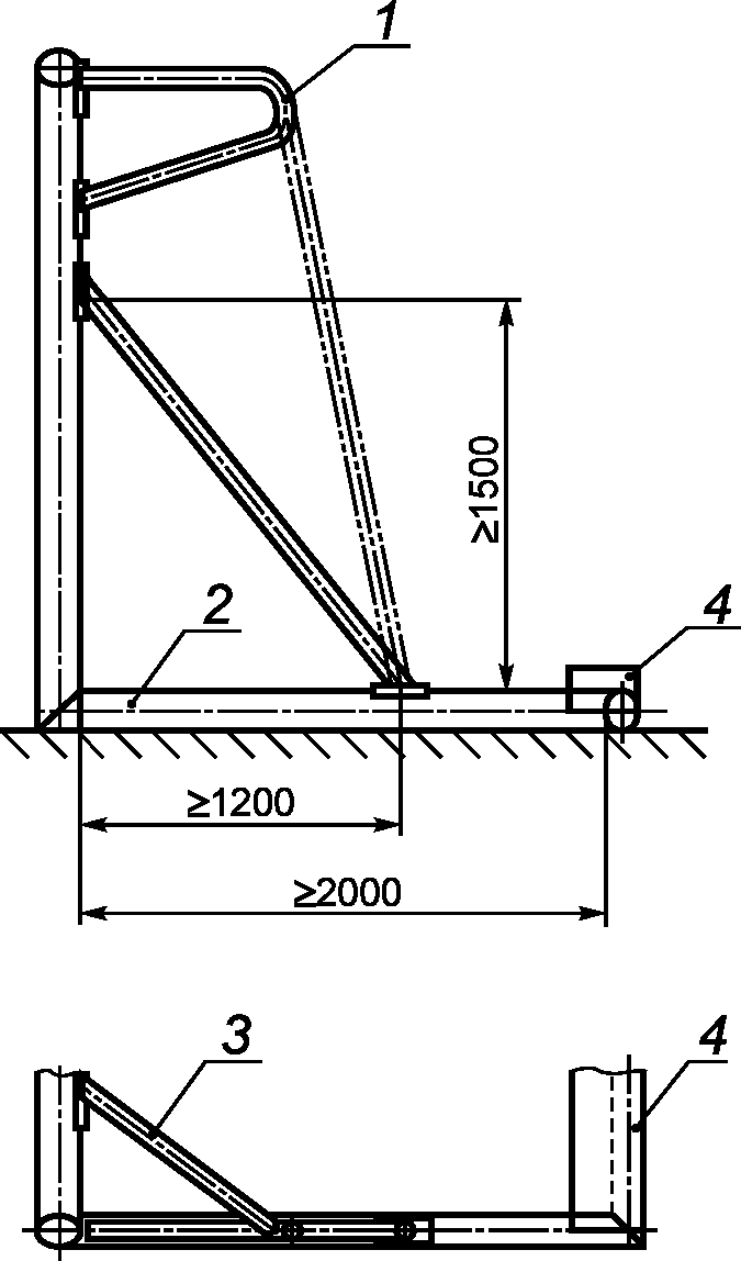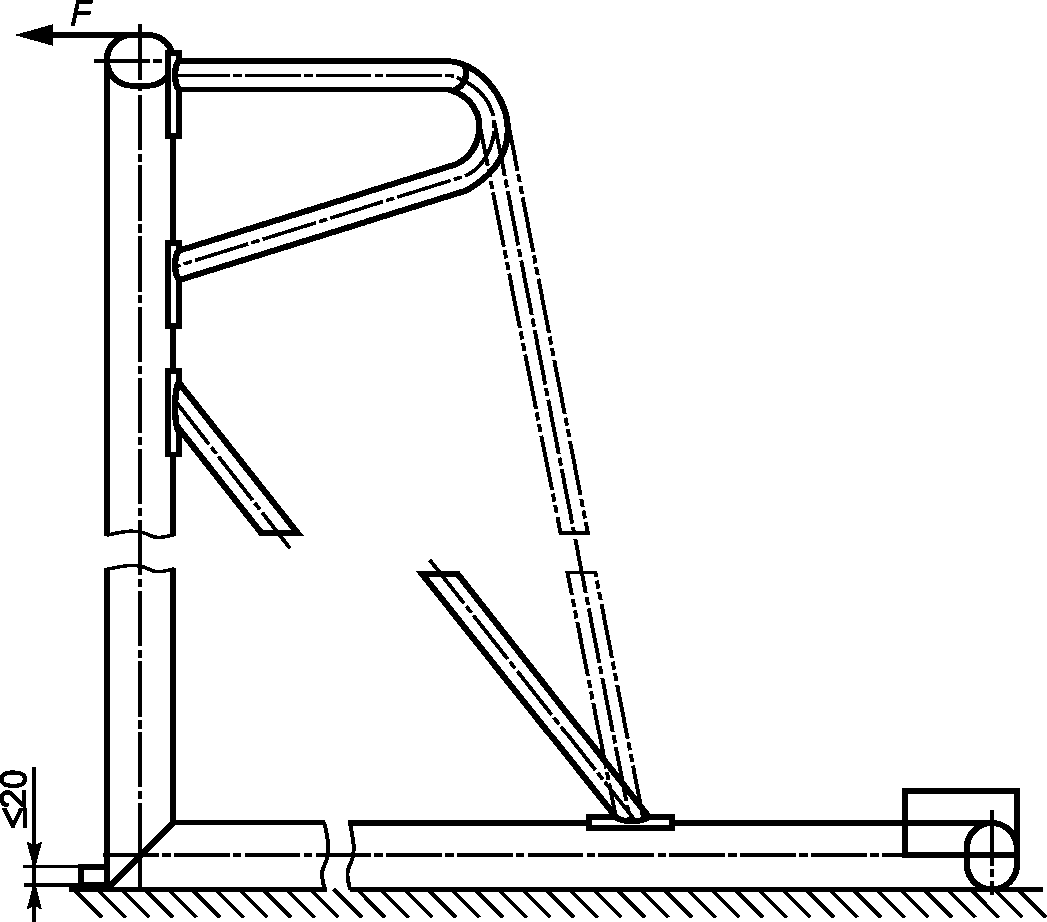 Б.2.3.1. Прикладывают горизонтальную сосредоточенную нагрузку F = (1100 +/- 50) Н к середине перекладины и выдерживают в течение (60 +/- 10) с, используя веревку длиной 3000 мм, в соответствии с рисунком Б.2.