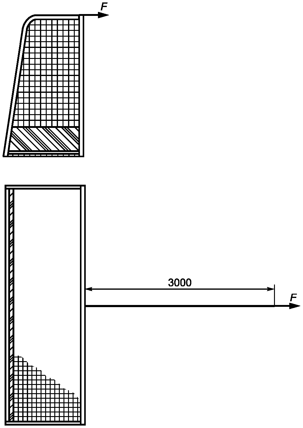 Устройство нагружения должно обеспечивать сосредоточенную горизонтальную нагрузку (1100 +/- 50) Н, прикладываемую к середине перекладины ворот.