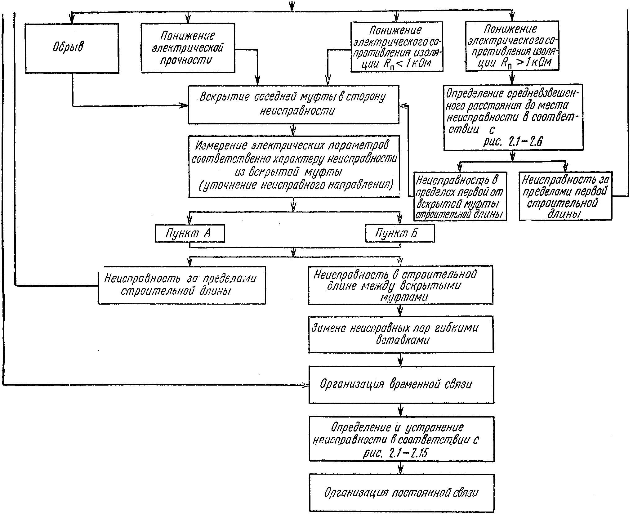 1.9. Последовательность и расчетные сроки восстановительных работ регламентируются технологической картой, которая разрабатывается в соответствии с алгоритмом устранения аварий (рис. 1.1) для каждой кабельной линии с учетом типа кабеля и условий прохождения трассы и утверждается руководством ТУСМ, ТУРМ, ЭТУС.