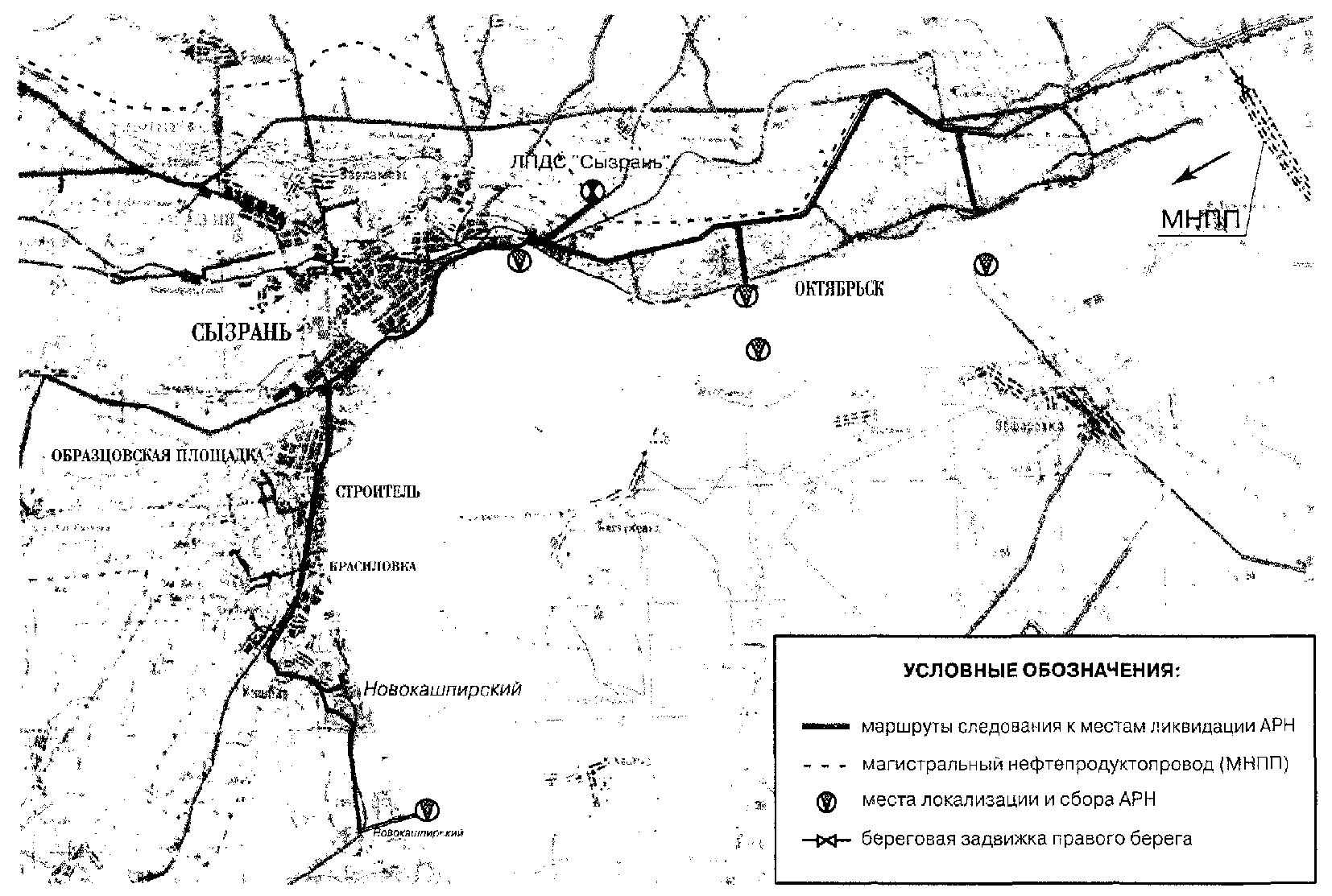- мест размещения аварийно-восстановительных пунктов (АВП), перекачивающих станций (ПС), в том числе ЛПДС, головных и промежуточных станций, отводов от МНПП, нефтебаз, наливных пунктов, а также складирования технических средств для ликвидации АРН;