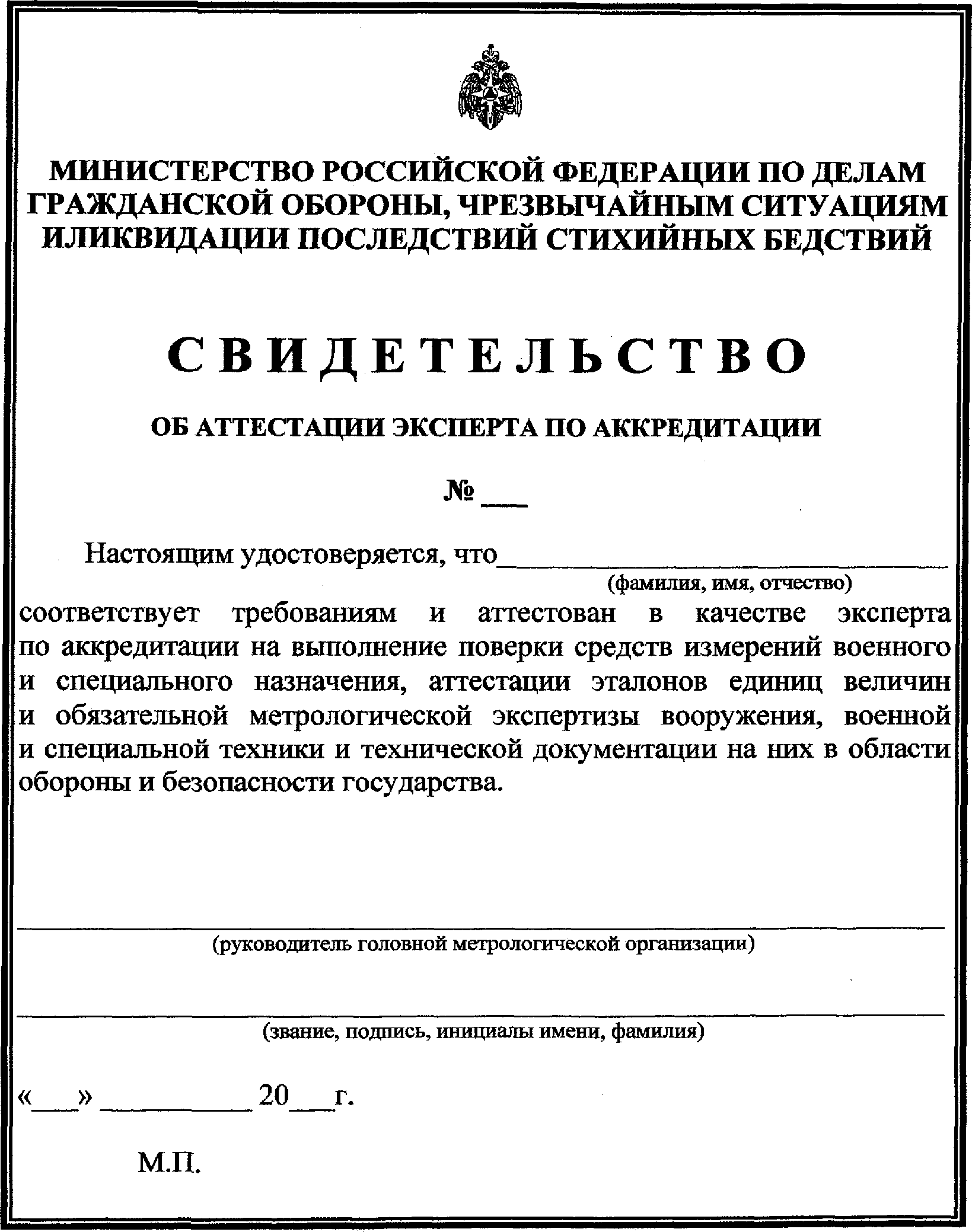 "Руководство по аккредитации учреждений и организаций, находящихся в ведении МЧС России, на выполнение поверки средств измерений военного и специального назначения, аттестации эталонов единиц величин и обязательной метрологической экспертизы вооружения, военной и специальной техники и технической документации на них в области обороны и безопасности государства"