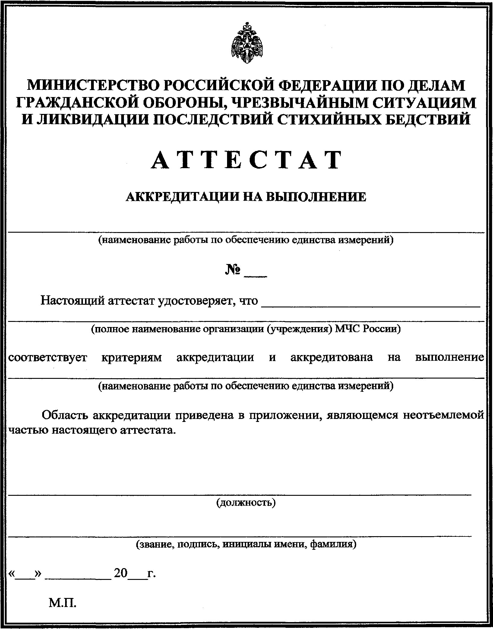 "аккредитация" - подтверждение МЧС России соответствия заявителя критериям аккредитации, являющееся официальным свидетельством его компетентности при осуществлении работ по обеспечению единства измерений в определенной области аккредитации;