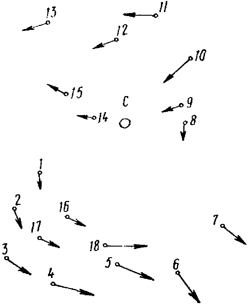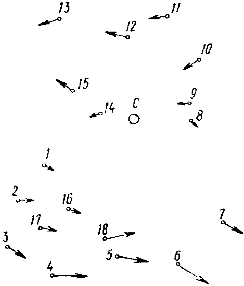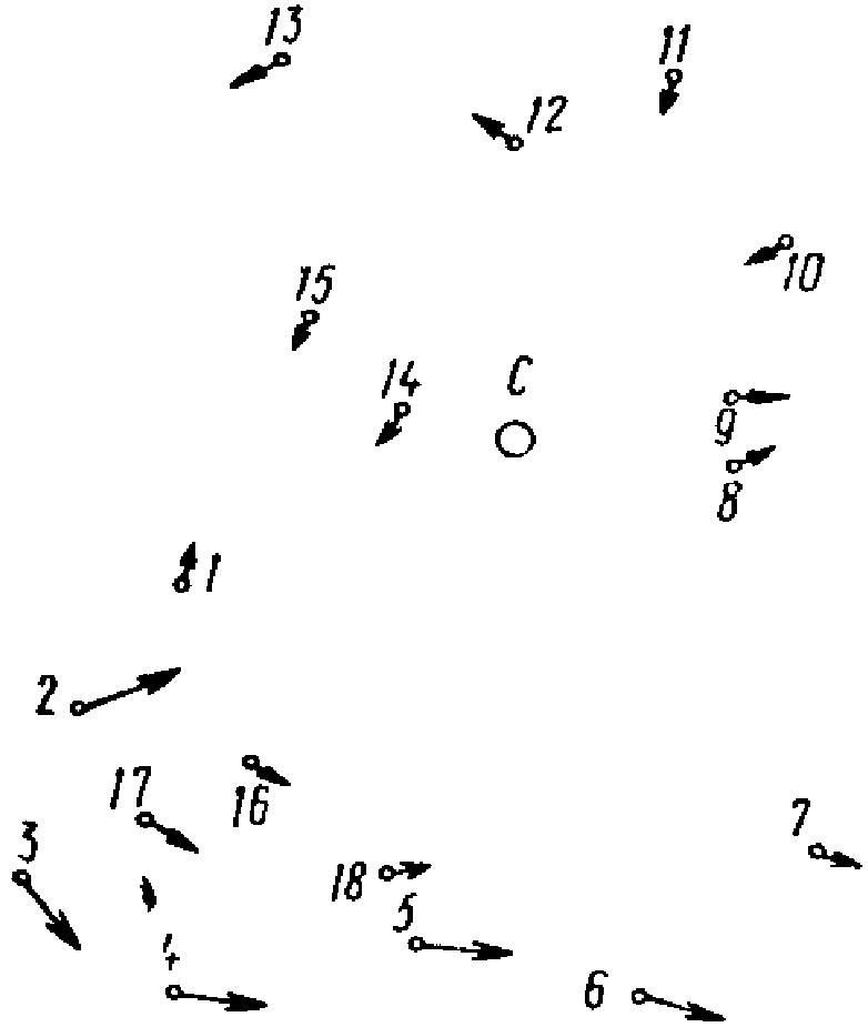 18 показаны цветовой тон и насыщенность исследуемых цветов при естественном свете и измененные характеристики этих цветов - концы векторов - при освещении люминесцентной лампой ЛБ; на