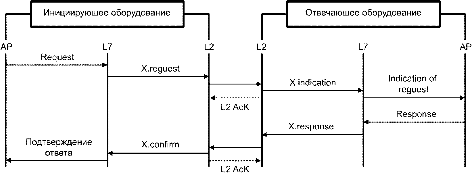 Подтверждение | Примитив выдается поставщиком услуг (L2) и передается пользователю услуги (L7) для передачи результатов одного или нескольких связанных предыдущих запросов на обслуживание, вызванных пользователем, инициирующим услуги (L7), то есть приходит уведомление от инициирующего поставщика услуг (L2) инициирующему пользователю услуги (L7), о том, что блок данных ответа и/или статус был получен |