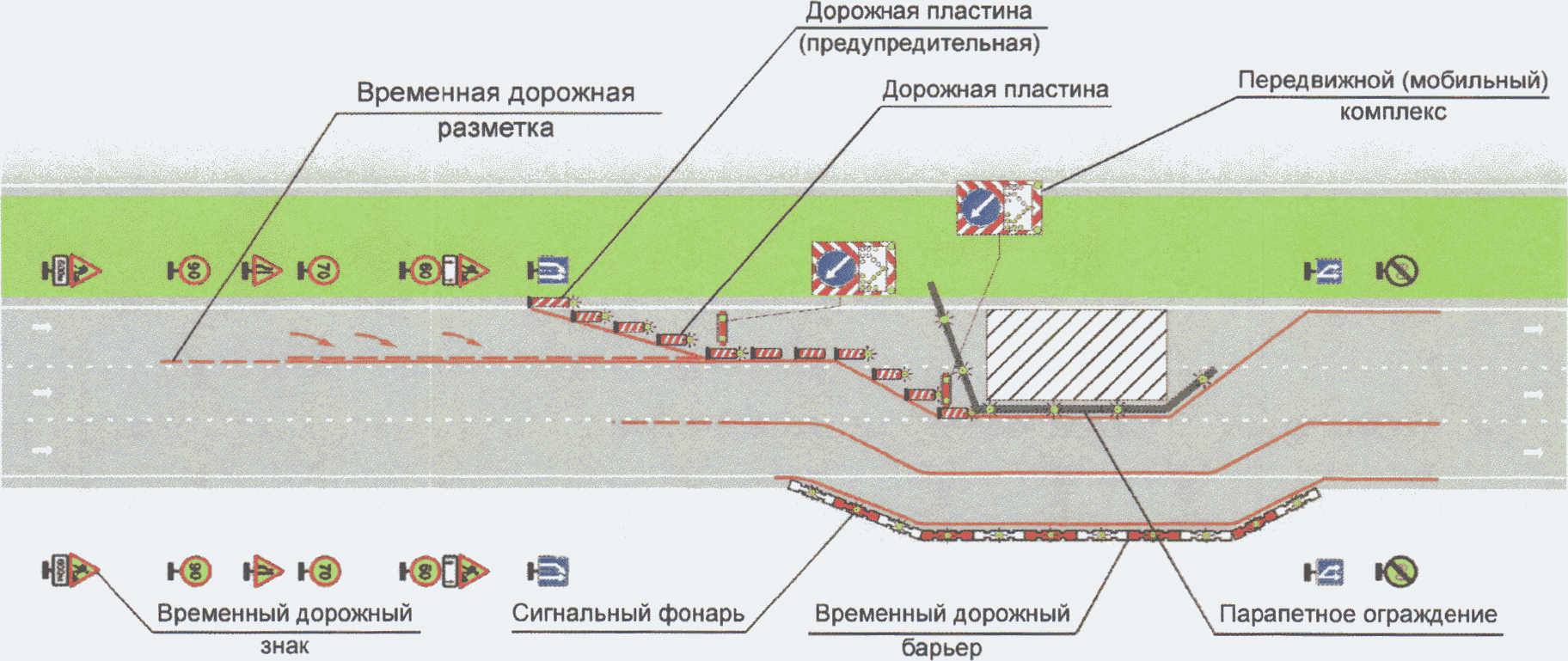 <1> дорог, а также других работ на участках проезжей части, обочин, откосов земляного полотна, разделительной полосы, тротуаров, пешеходных и велосипедных дорожек, трамвайных путей и железнодорожных переездов для обустройства зоны работ используют временные технические средства организации дорожного движения по