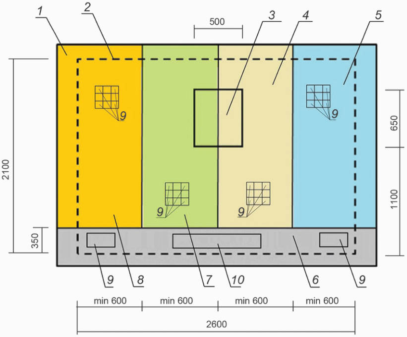 9 - зоны проведения испытаний на прочность сцепления слоев