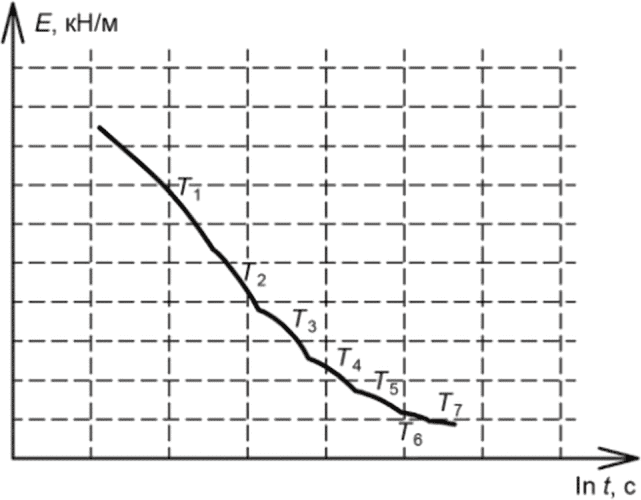 7.2.2.9 Кривые модуля ползучести для разных ступеней температур строят на одном графике в полулогарифмической системе координат