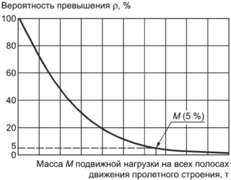 где M(5%) - масса автомобильной нагрузки (т), определенной по данным о структуре транспортного потока с вероятностью превышения 5%, расположенной на всей длине пролетного строения и на всех полосах движения;