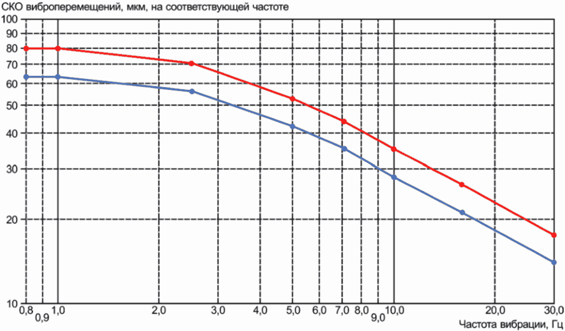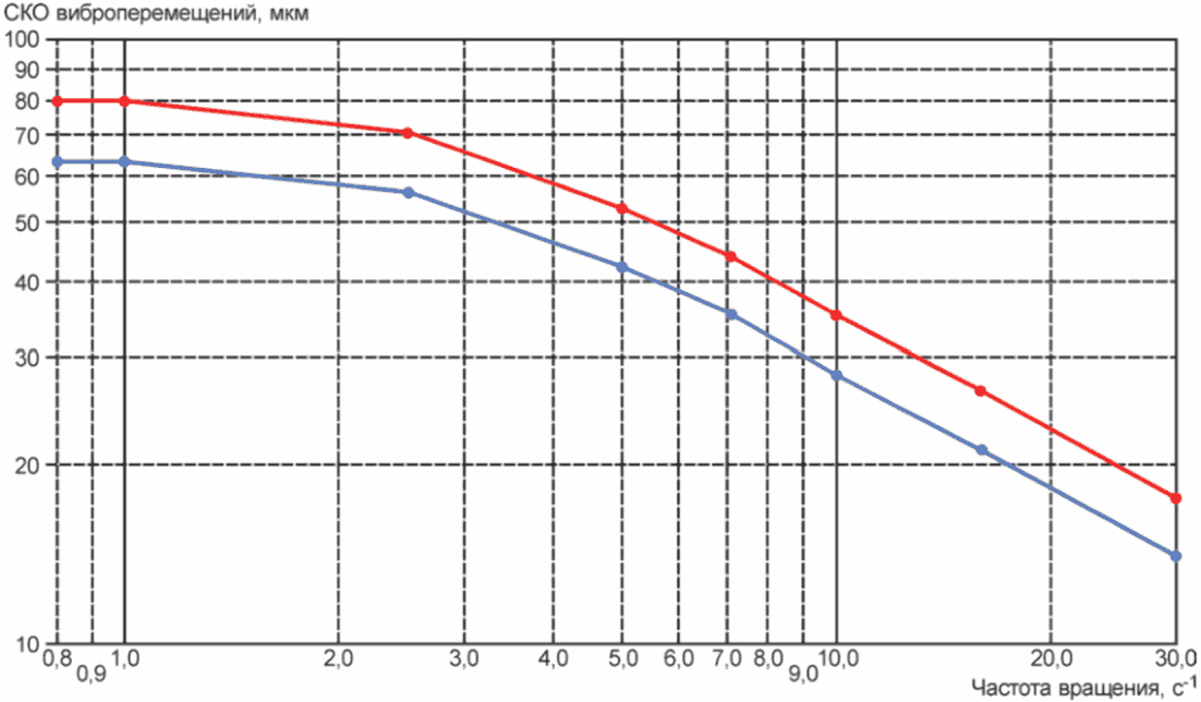Частота вращения/вибрации, с-1/Гц | СКО предупредительного уровня, мкм | СКО аварийного уровня, мкм |