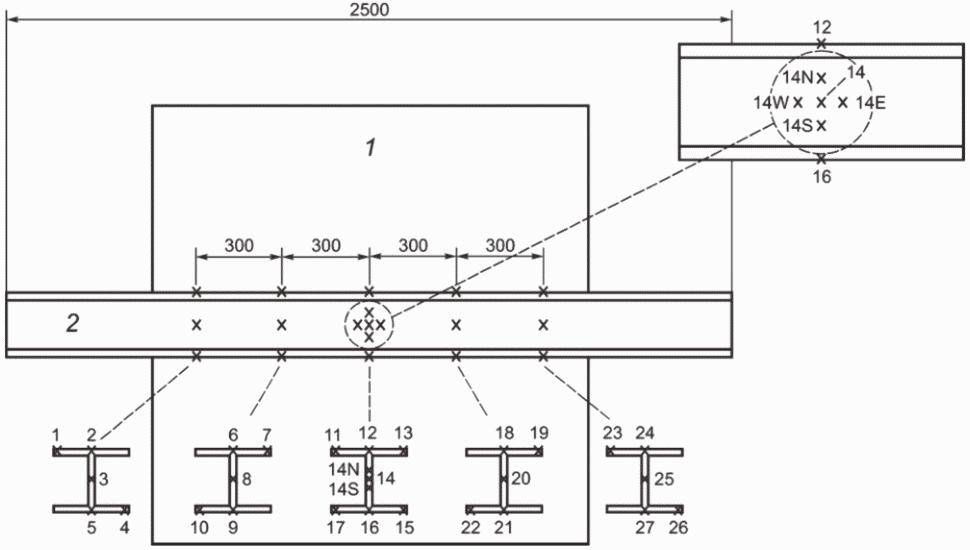 Рисунок У.1 - Схема мест измерения толщины образца на балке