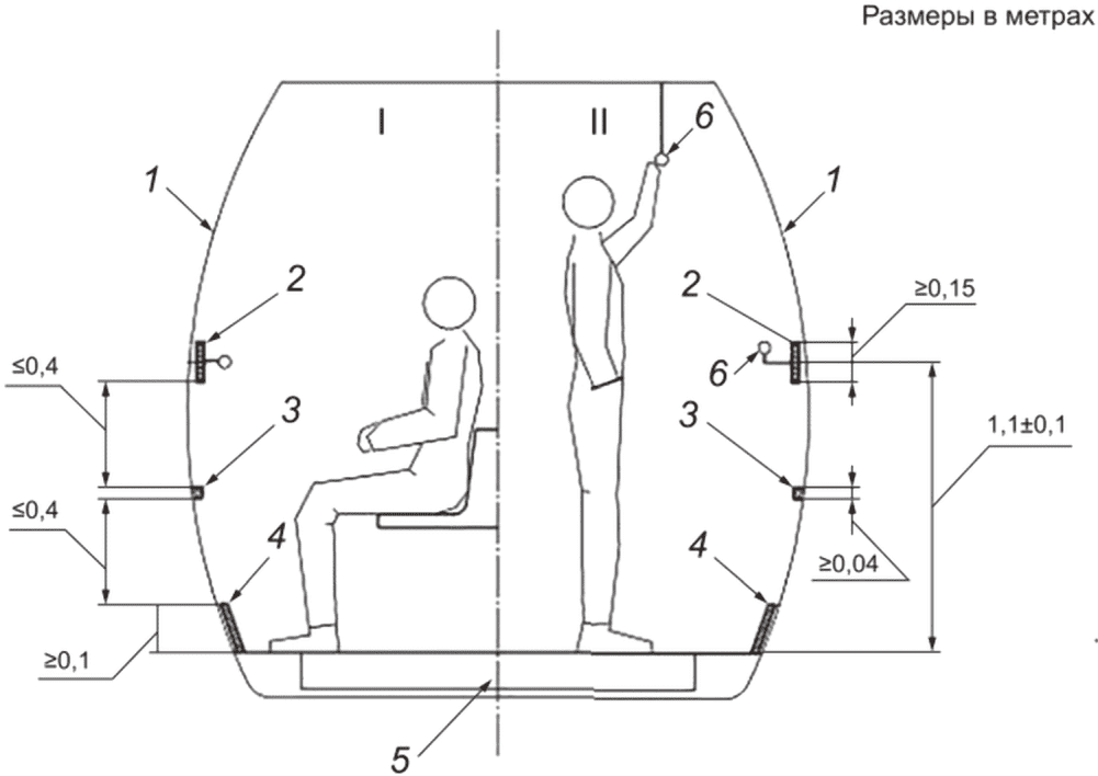 рисунок 3) должны быть оснащены защитными ограждениями (поручнями или планками). При транспортировании пассажиров в положении сидя спиной внутрь кабины или стоя максимальное расстояние между элементами защитного ограждения не должно превышать 0,4 м. Главный элемент защитного ограждения (планки с поручнями) должен быть расположен горизонтально по периметру кабины, кроме дверных проемов, на высоте (1,1 +/- 0,1) м от пола кабины. Минимальная ширина планки основного элемента защитного ограждения должна составлять не менее 0,15 м. Минимальная ширина элемента защитного ограждения в виде промежуточной планки должна составлять не менее 0,04 м. Напольная планка должна быть рассчитана с учетом нагрузки 2 Н/мм