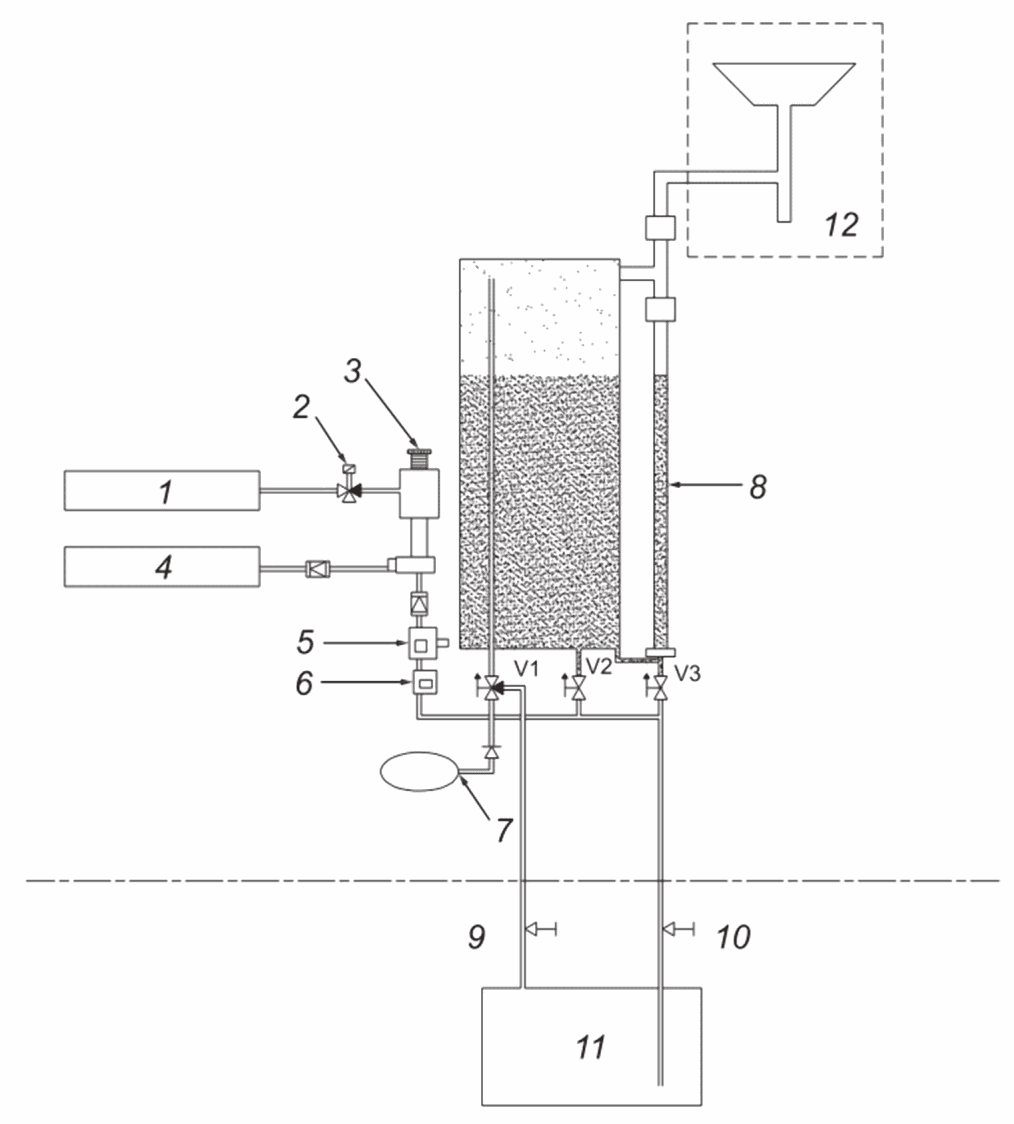 12 - выход в атмосферу; V1 - клапан 1; V2 - клапан 2;