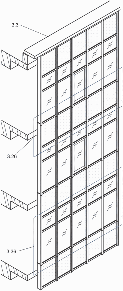 1 Фасадная светопрозрачная конструкция спроектирована как самонесущая конструкция, которая передает собственный вес и постоянные нагрузки, нагрузки окружающей среды (ветер, снег и т.п.) и сейсмические нагрузки на основную конструкцию здания.