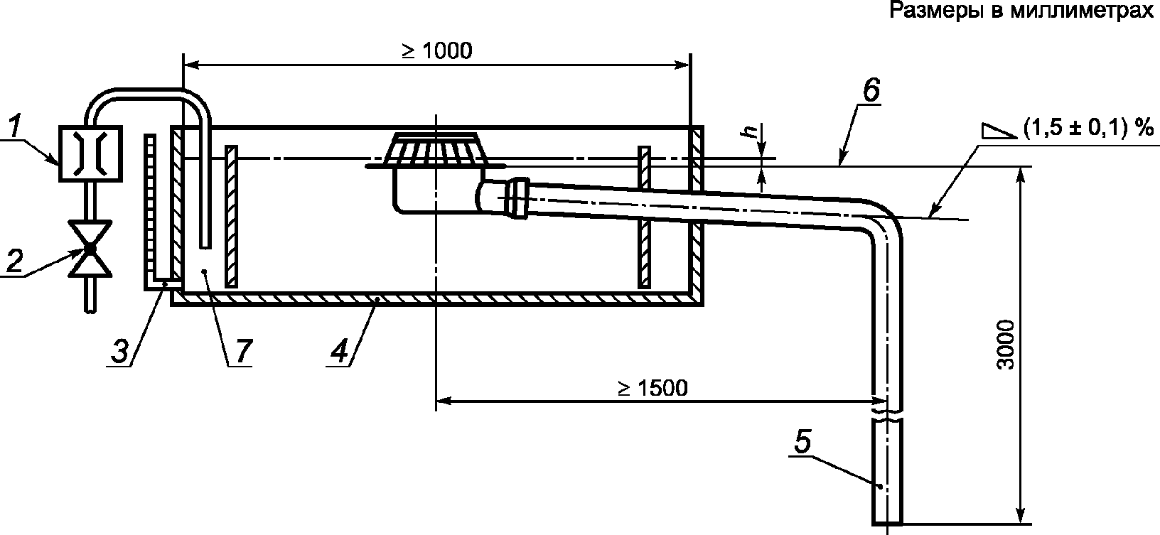 3.9 высота подпора: Высота h от линии зеркала воды до края перелива кровельной воронки или водосточного трапа, как показано на рисунке 4.