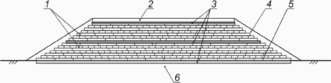 3.11 комбинированная насыпь: Инженерное сооружение из ППС блоков, в котором один или несколько элементов конструкции насыпи выполнены из материала, имеющего среднюю плотность (например, распределительная плита, выполненная из пенобетона) ниже средней плотности песка, в пределах которого дорожная одежда расположена выше уровня земли.
