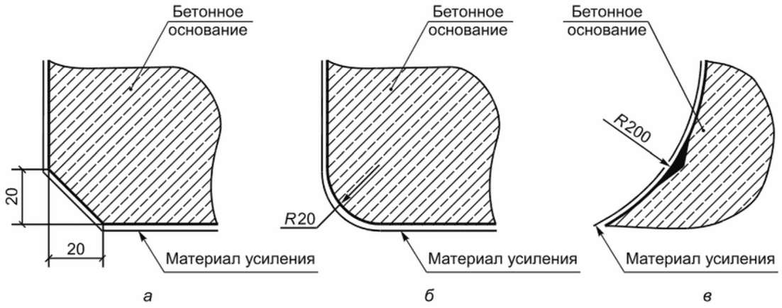 При оборачивании конструкций с наружных углов должна быть снята фаска с катетом от 20 до 30 мм или сделано скругление радиусом от 20 до 30 мм. На внутренних углах ремонтными смесями должна быть выполнена галтель радиусом не менее 200 мм в соответствии с