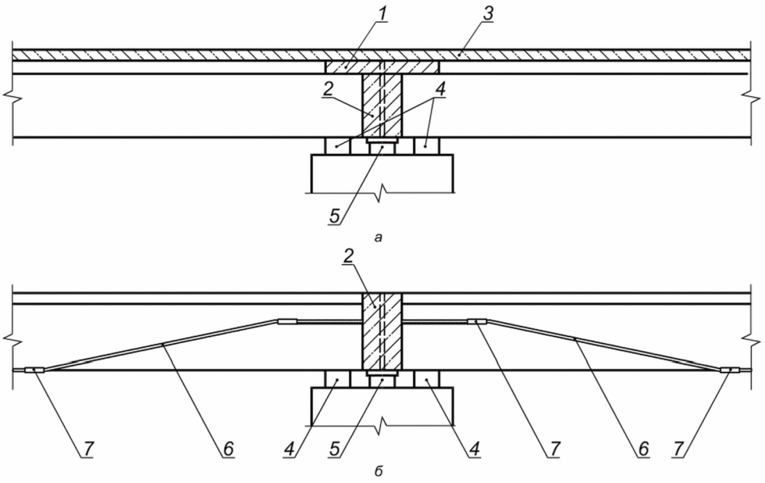 А.4 Схемы усиления железобетонных пролетных строений путем перевода статически разрезных систем в балочно-неразрезные могут быть представлены двумя основными типами, показанными на