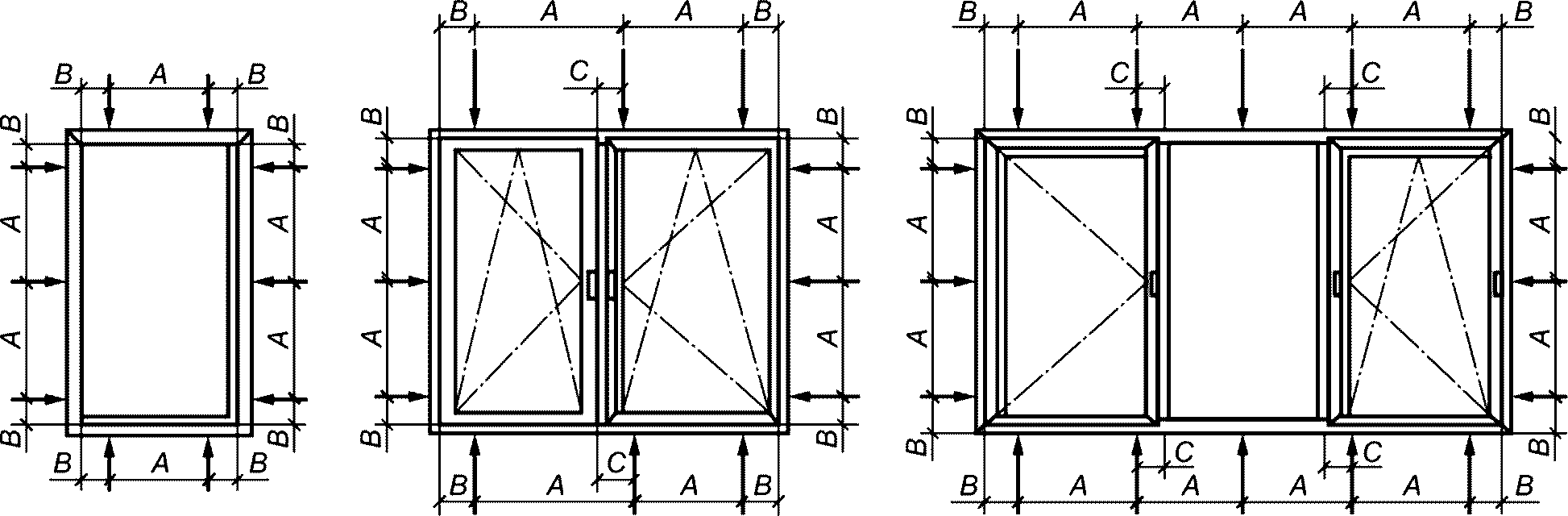 рисунке В.10 представлены схемы крепления различными крепежными изделиями на примере оконных блоков из поливинилхлоридных профилей как наиболее широко применяемых в отечественном строительстве.