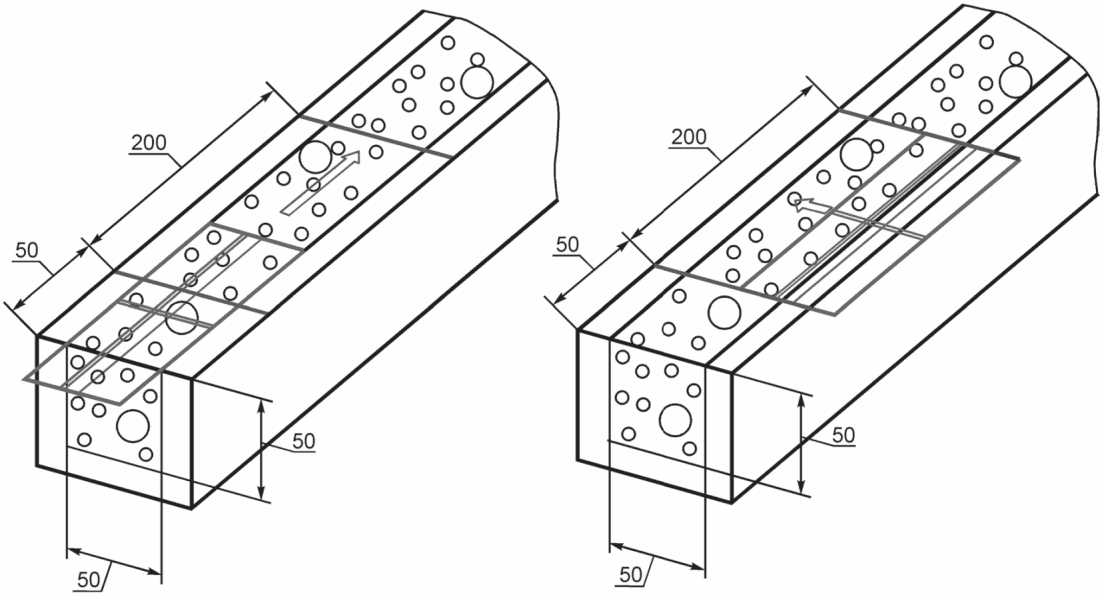 С помощью шаблона производят разметку поверхности среза на три участка длиной 200 мм, отступая от торцевой поверхности формы на 50 мм.