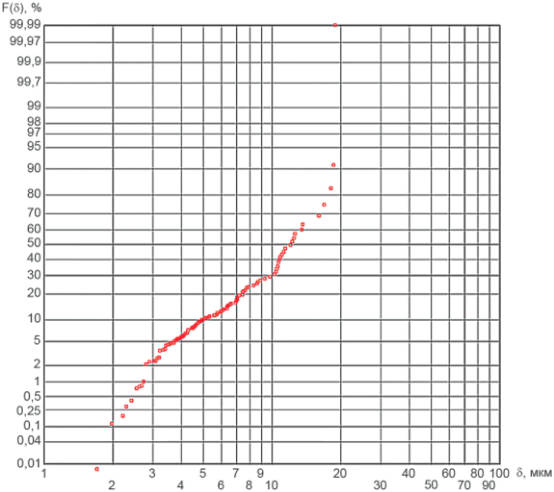 5.4.3 Графическое представление результатов микроскопического анализа фракционного состава пыли предполагает построение интегральных кривых распределения массы частиц пыли по диаметрам в вероятностно-логарифмической сетке координат
