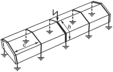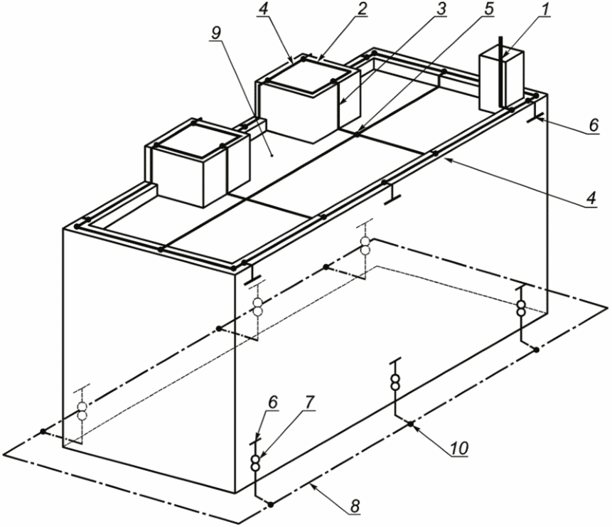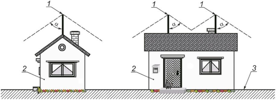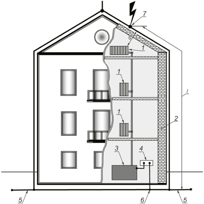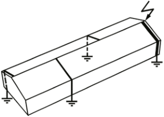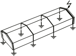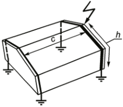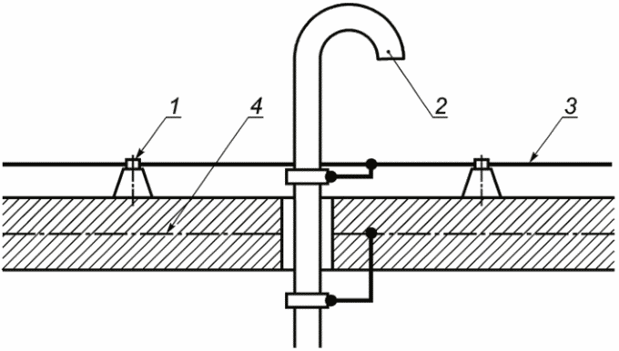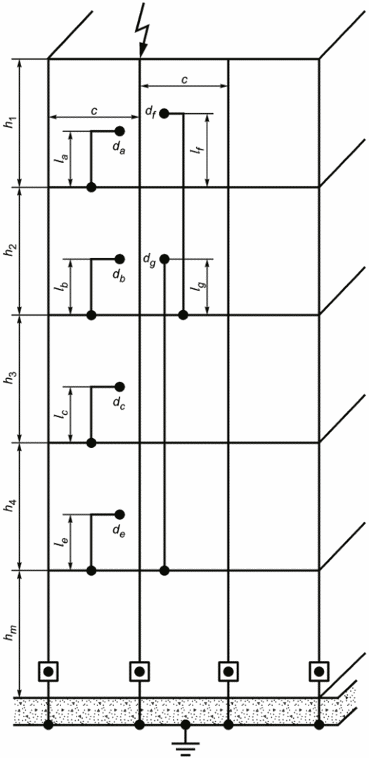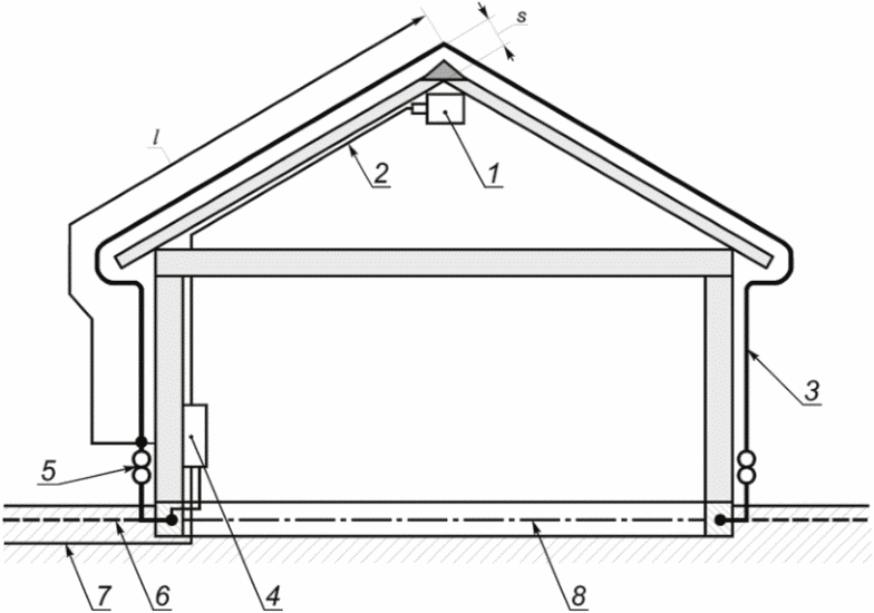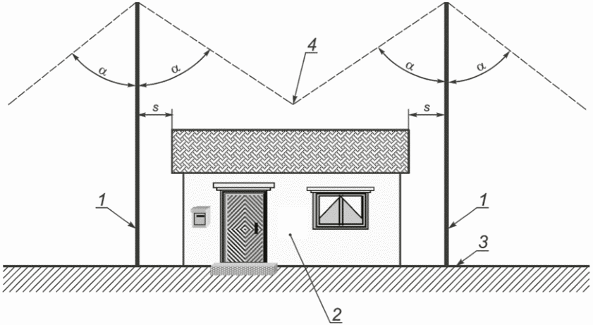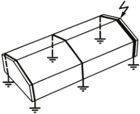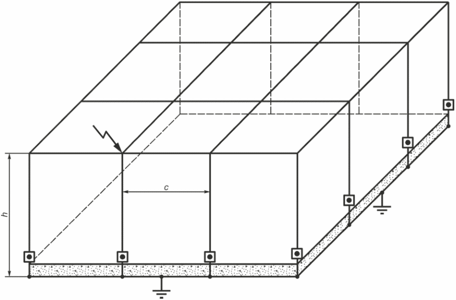 3.4 неизолированная внешняя система молниезащиты (external LPS not isolated from the structure to be protected): Система молниезащиты, включающая в себя молниеприемники и токоотводы, выполненные таким образом, что ток молнии может протекать по защищаемому сооружению.