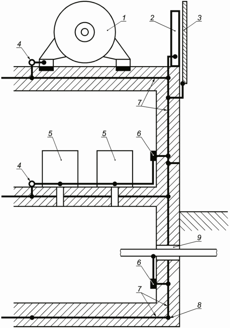3.8 кольцевой проводник (ring conductor): Проводник, образующий контур вокруг сооружения и обеспечивающий взаимное соединение токоотводов для распределения тока молнии между ними.