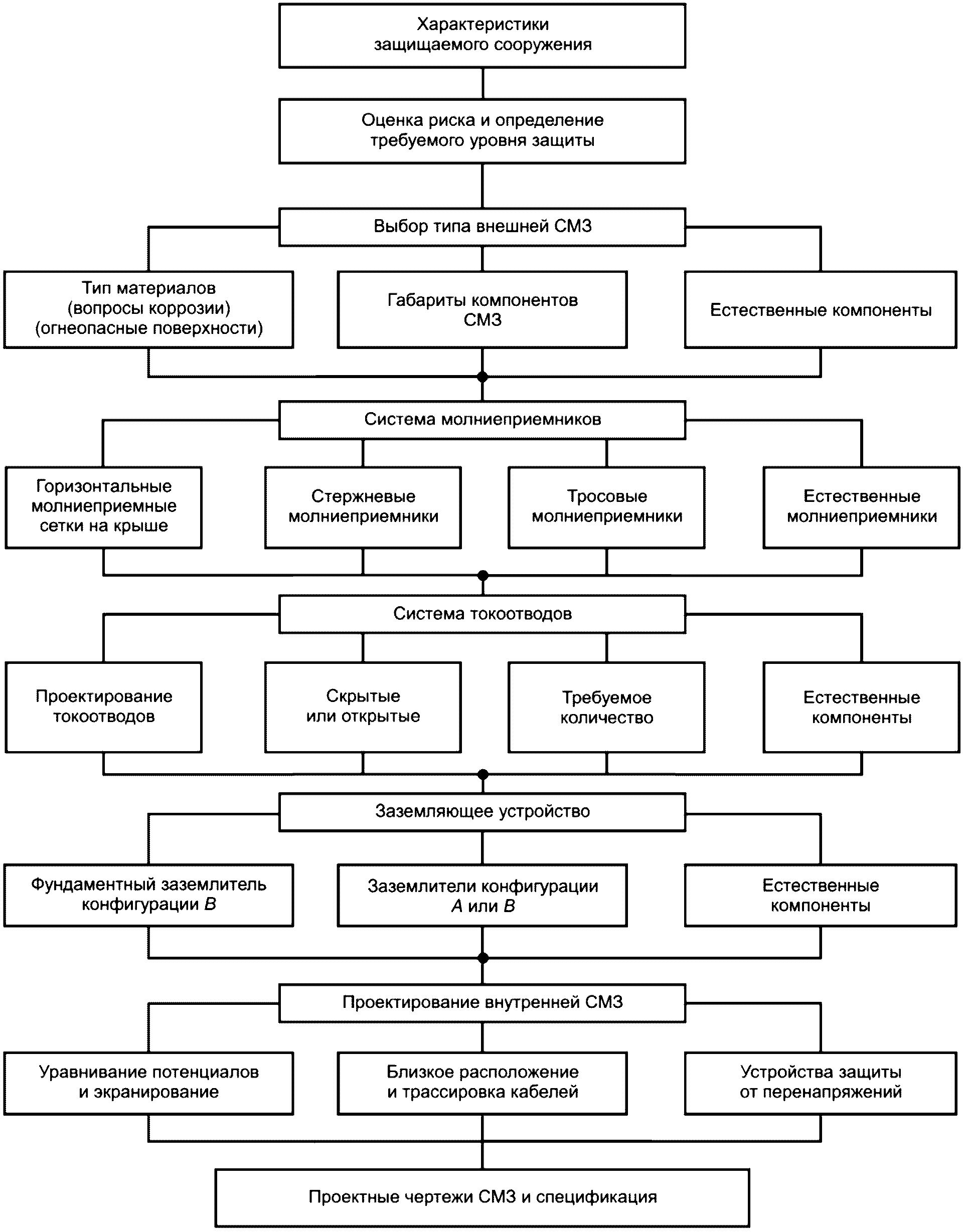 На начальной стадии проектирования нового здания или сооружения тип и размещение СМЗ должны быть выбраны с учетом максимального использования электропроводящих частей сооружения. При этом проектирование и конструкция СМЗ упрощаются, общие эстетические аспекты могут быть улучшены, а эффективность СМЗ может быть повышена при минимуме затрат средств и усилий.