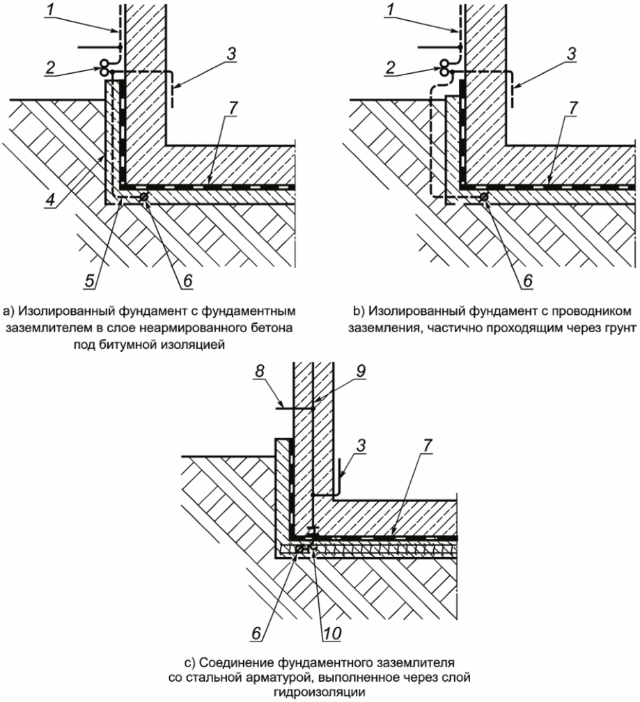 3.12 фундаментный заземлитель (foundation earth electrode): Проводящая часть, как правило, в виде замкнутого контура, расположенная в грунте под фундаментом здания или, что предпочтительнее, в бетонном фундаменте здания.