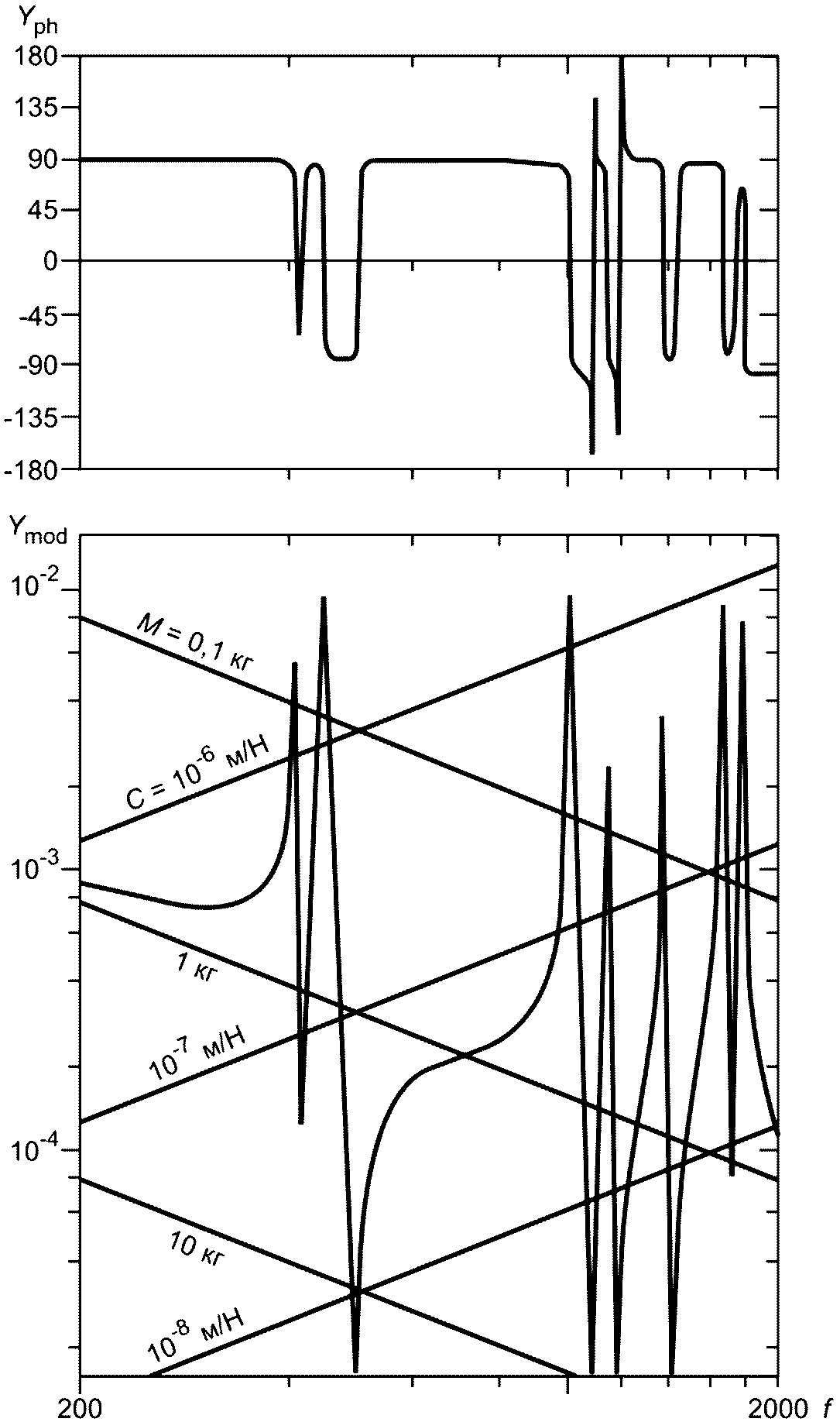 -10 м/Н (что является типичным значением для преобразователя данного вида). В диапазоне частот от 30 до 1100 Гц график подвижности близок к линии постоянной массы, которая должна быть равна сумме масс блока, части импедансной головки между монтажной поверхностью и преобразователем силы и крепежного приспособления. Если указанное равенство не соблюдается, это означает, что система измерений подвижности имеет несоответствие, которое должно быть устранено. Возможными причинами несоответствия могут быть неправильно выбранные или определенные значения характеристик измерительной системы.