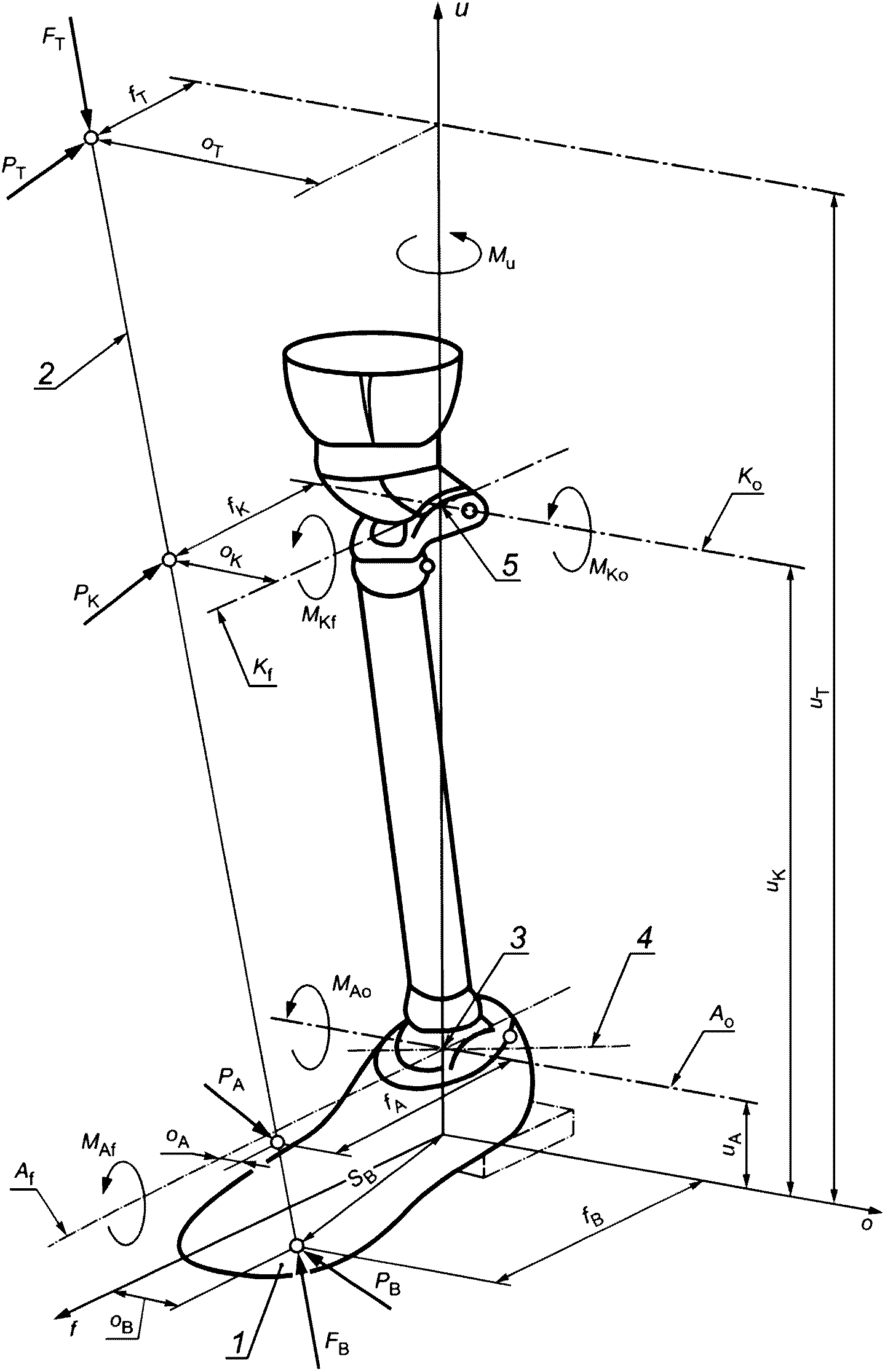 примечание 2), при которых сложные нагружения, как правило, воспроизводятся приложением одиночной силы. Сложные нагружения в испытательном образце соответствуют пиковым значениям нагрузок, которые обычно возникают в различные моменты фазы опоры при ходьбе.