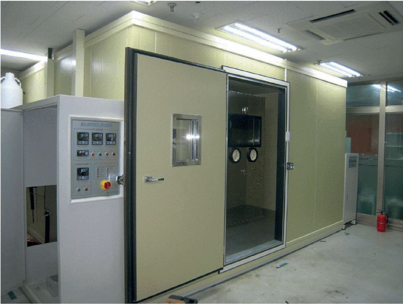 Внутри испытательной камеры устанавливают блок HEPA-фильтра для очистки воздуха от частиц, блок кондиционирования воздуха для контроля температуры и влажности и систему для очистки воздуха. В частности, для больших испытательных камер применяют вентилятор для равномерного распределения бактерий.
