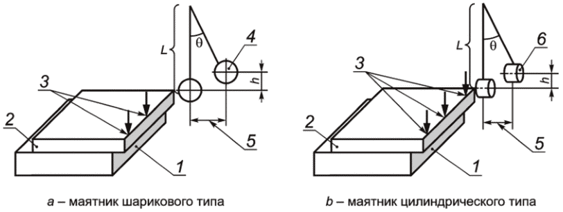 Установка для испытаний на боковой удар маятника включает: металлическое (пластмассовое) приспособление в качестве рычага маятника, ударную часть маятника в форме шара или цилиндра и жесткую пластину, как показано на рисунке 4. Рычаг маятника изготавливают из жесткого материала, например металла. Образец должен быть зафиксирован на жесткой пластине с использованием зажима. Конструкция, состоящая из рычага маятника, соединенного с ударной частью (шаром или цилиндром), должна быть жесткой для обеспечения постоянной силы столкновения. Должны быть определены условия испытаний на боковой удар маятника, включая угол удара, тип (материал) ударной части маятника (пластмасса или металл), массу и размер (диаметр) ударной части маятника, длину рычага маятника, расстояние по горизонтали от позиции сброса ударной части маятника до позиции ее столкновения с панелью и число наносимых ударов, потому что характеристики качества изображения панели дисплея могут зависеть от вышеприведенных условий испытаний. Для получения более надежных результатов должны быть проведены испытания для нескольких позиций воздействия удара на панель. Кинетическую энергию удара следует оценивать для каждого испытания в целях обеспечения повторяемости метода. Кинетическую энергию можно рассчитать из значения массы ударной части маятника и длины маятникового рычага.
