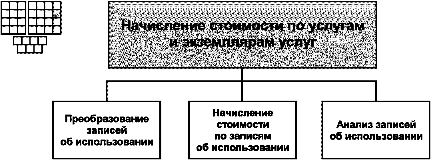 | Начисление стоимости по записям об использовании (Rate usage records) | Процессы выбора и применения тарифов и алгоритмов начисления стоимости к отдельным параметрам, входящим в состав записей об использовании Процессы вычисления общей начисленной стоимости на каждую запись об использовании и занесения этой величины в саму запись |