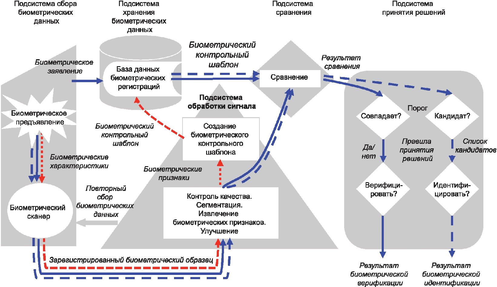 ГОСТ ISO/IEC 2382-37 запись биометрических данных индивида в базе данных называется биометрическим контрольным шаблоном, а биометрический образец, используемый для сравнения с сохраненным биометрическим контрольным шаблоном, - биометрической пробой. Можно искать совпадение между биометрической пробой индивида и определенным биометрическим контрольным шаблоном, хранящимся в базе данных, или совокупность биометрических контрольных шаблонов в базе данных, совпадающих с представленной биометрической пробой, и возвращать идентификатор любого совпавшего биометрического контрольного шаблона. В обоих случаях необходимо установить порог, указывающий, насколько близким должно быть сравнение, прежде чем можно будет заключить, что биометрическая проба и биометрический контрольный шаблон зарегистрированы от одного и того же телесного источника (совпадение). При этом могут быть допущены следующие ошибки: либо ложное несовпадение, в том случае когда совпадение не объявляется, а биометрическая проба и биометрический контрольный шаблон действительно зарегистрированы от одного телесного источника, или ложное совпадение, когда совпадение объявляется, а биометрическая проба и биометрический контрольный шаблон зарегистрированы от различных телесных источников. О доле таких ошибок судят по общему количеству сравнений, вероятности ложного совпадения (ВЛС) и вероятности ложного несовпадения (ВЛНС) для данной технологии и совокупности в данной среде приложения.