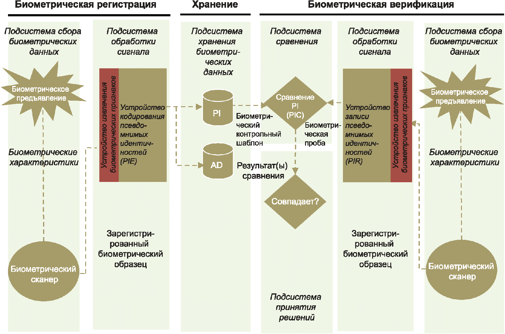 Например, субъект может заявить о том, что он является источником биометрических данных отпечатков пальцев, хранящихся на иммиграционной карте. Для того чтобы подтвердить это заявление, субъект вставляет карту в считыватель карт, который считывает запись биометрического контрольного шаблона, а затем помещает палец на устройство считывания отпечатков пальцев. В системе осуществляется сравнение биометрических характеристик отпечатка пальца, полученных с устройства считывания отпечатков пальцев, с характеристиками биометрического контрольного шаблона, записанными на карте. В соответствии с установленными порогами система может сделать вывод о том, что субъект действительно является источником биометрического контрольного шаблона, хранящегося на карте, и поэтому ему должны быть предоставлены права и привилегии, связанные с картой. При этом предполагается, что карта не была подделана. С помощью биометрической верификации можно определить только то, что человек предъявил биометрические характеристики, которые близки к совпадению с теми, что записаны на карте.