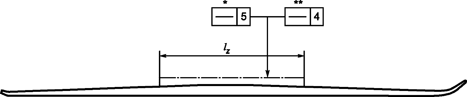 Отклонения от прямолинейности продольного профиля от плоского профиля допустимы только в виде кривой с постоянными параметрами по длине свободной зоны; допуск на прямолинейность в этой зоне, когда основание лыжи прижимается к плоской поверхности, следующий (см.