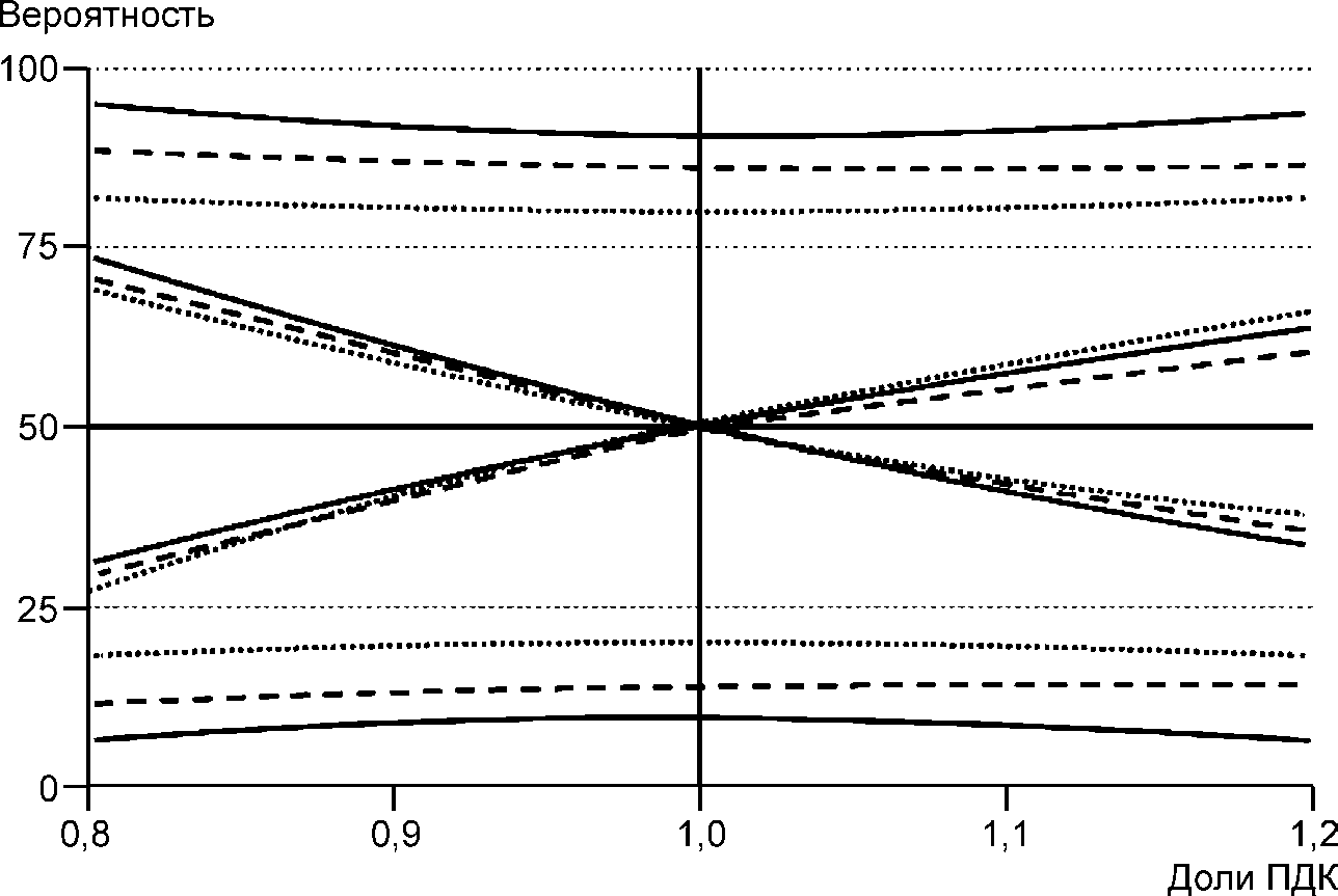 , равной 50%, вокруг результатов измерений включают в себя значения ПДК. В такой ситуации риски поставщика и потребителя сравнительно велики и достигают своего максимума в области