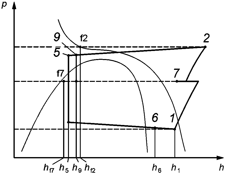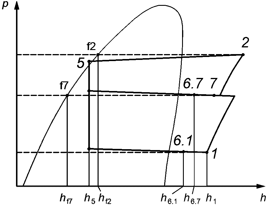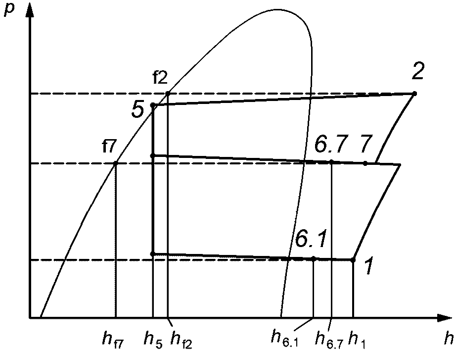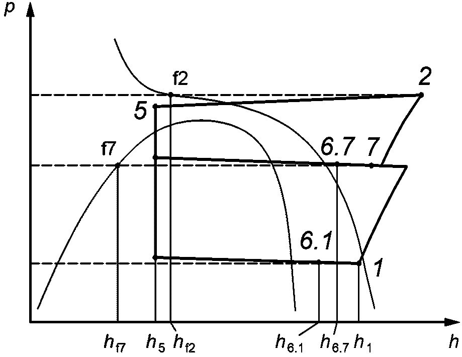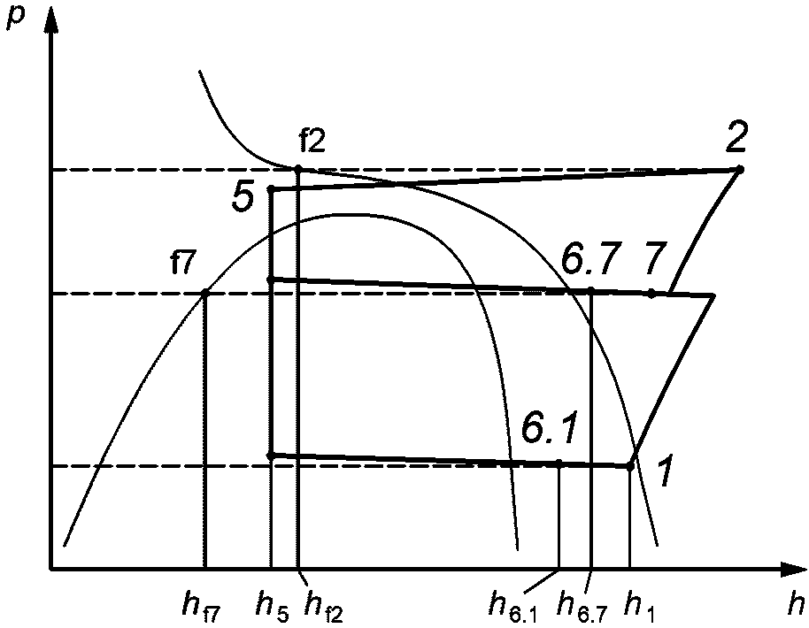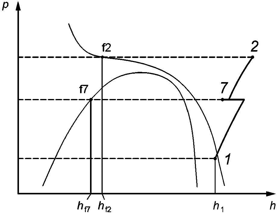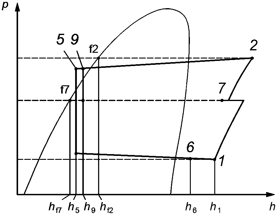 Измерения рабочих характеристик компрессоров на испытательных стендах, как правило, не подходят для заданного условия испытания. Для определения промежуточного давления в точке впрыска p7 должен быть рассчитан тепловой баланс на теплообменнике экономайзера при условии, что характеристики постоянны.