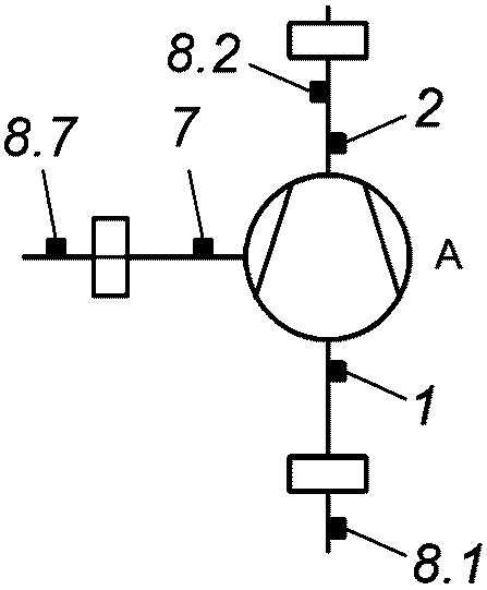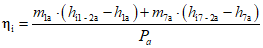 Изоэнтропная мощность равна мощности сжатия от давления всасывания в точке 1 до давления нагнетания в точке 2 для массового расхода на всасывании плюс мощность сжатия от промежуточного давления в точке 7 до давления нагнетания в точке 2 для промежуточного массового расхода.