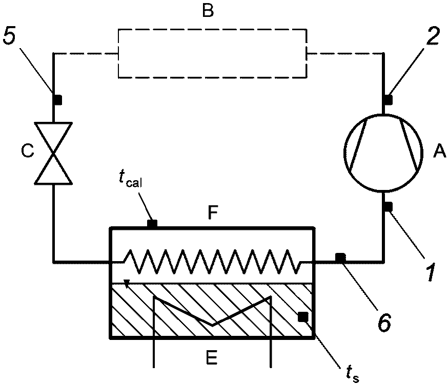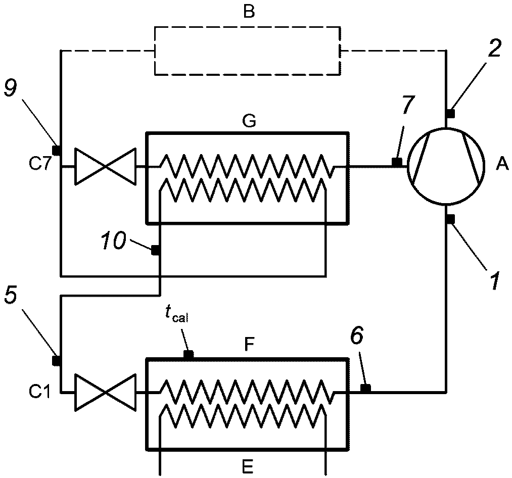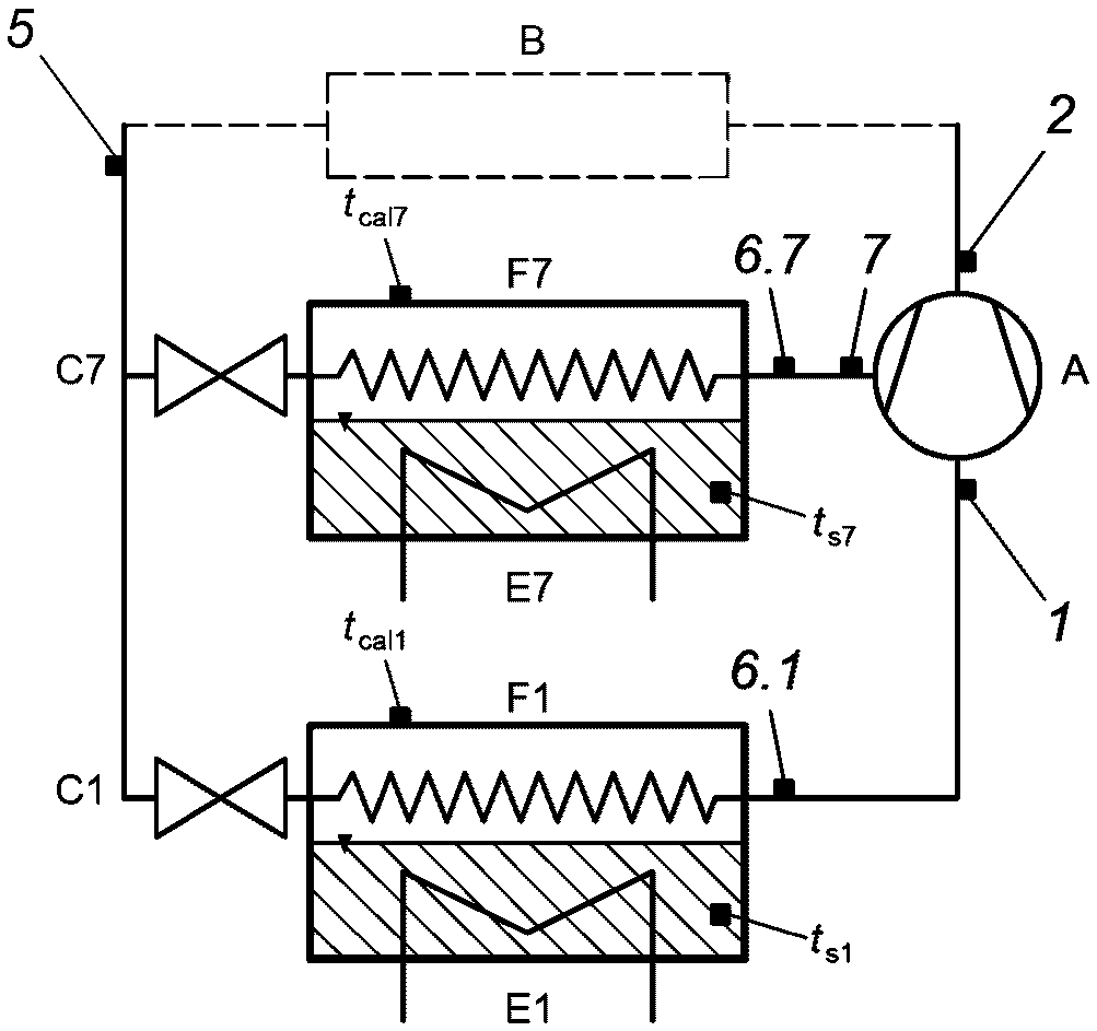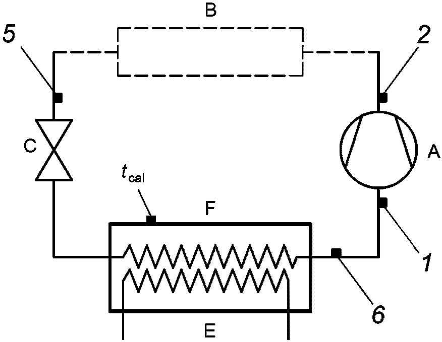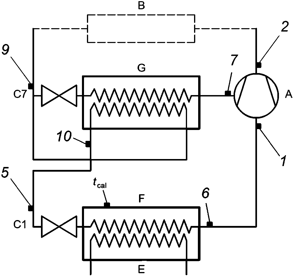 Согласно приведенному выше расчету в каждом испытании получают оценку коэффициента подачи и изоэнтропного КПД и значение промежуточного давления p7 в соответствии с заданными условиями испытаний. При условии, что коэффициент подачи и изоэнтропный КПД являются постоянными, это давление следует использовать для расчета холодопроизводительности компрессора.